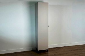 Корпус шкафа изготовлен из ЛДСП, что гарантирует прочность и долговечность. Фасад, покрытый МДФ в плёнке ПВХ, не только выглядит эстетично, но и защищает шкаф от повреждений. Особое внимание заслуживает фрезеровка фасадов, которая придаёт шкафу изысканный вид.